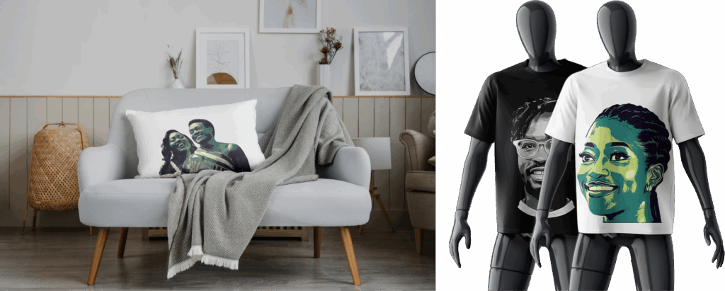 We can also print your Grinart on shirts, tote bags, throw pillows, mugs, bottles, and on many other items